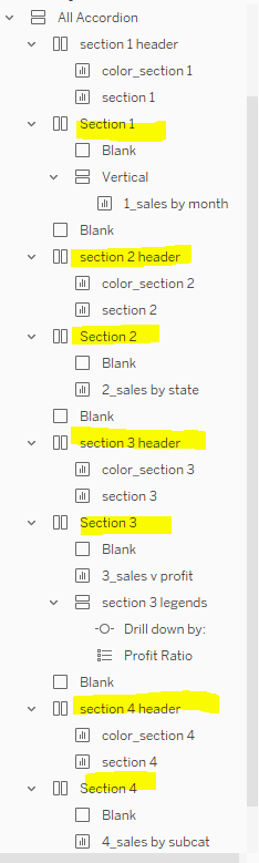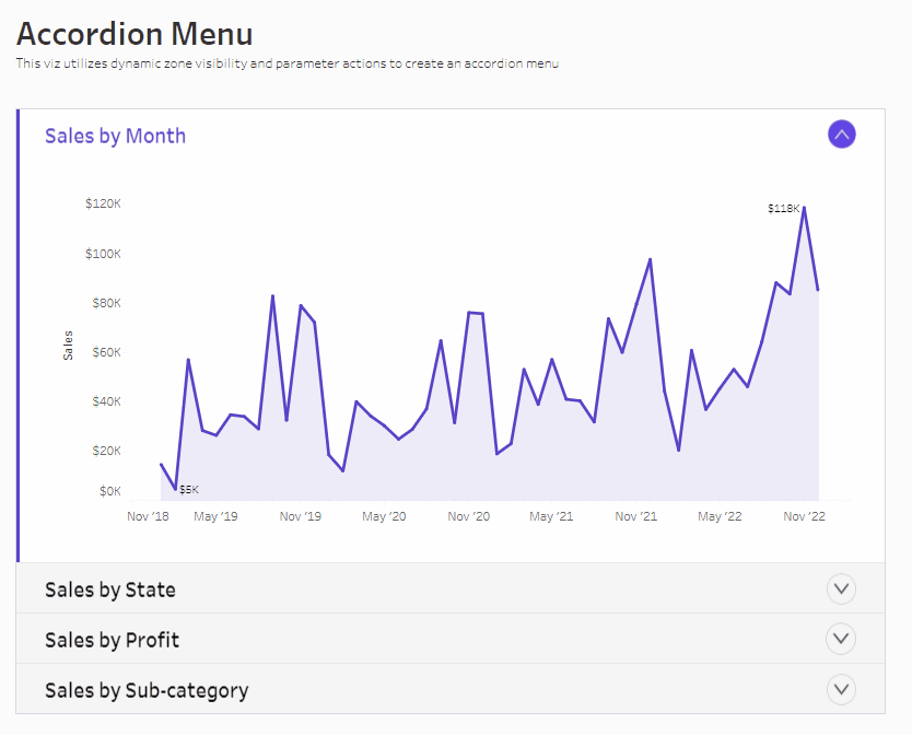 And there you have it! An accordion menu built entirely in Tableau using parameter actions and dynamic zone visibility. I hope you have fun playing around with this concept and making other designs and variations of this menu. I’d love to see what you come up with!