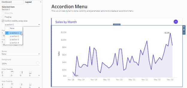 Select the container housing your section 1 chart, navigate to the layout pane, and click “Control visibility using”. Select the variable that corresponds to that section (p.section 1).