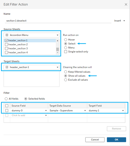 Remember those dummy fields we put on Detail? This is where they come into play. Create a filter action that runs on select of header_section 1. For target sheet, select header_section 1. Select “Show all values” when the selection is cleared. Under “selected fields”, make your source and target fields your dummy 0 and dummy 1 fields.