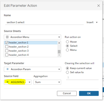 Each header has a parameter action associated with it. For a parameter action, you need to select the source sheet (i.e., the sheet you’re clicking to change the value of the parameter), the target parameter (i.e., the parameter that is being controlled by the action), and a source field (i.e., the value that gets passed to the parameter). Note the “source field” will be MIN(1), MIN(2), MIN(3), MIN(4) to correspond to the header value in the accordion parameter.