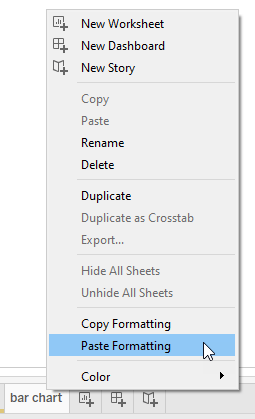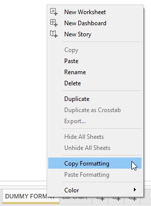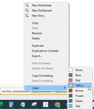 Color code sheets and dashboards to easily identify which sheets are used in which dashboards. Right click a tab, select “Color”, and then select your color.