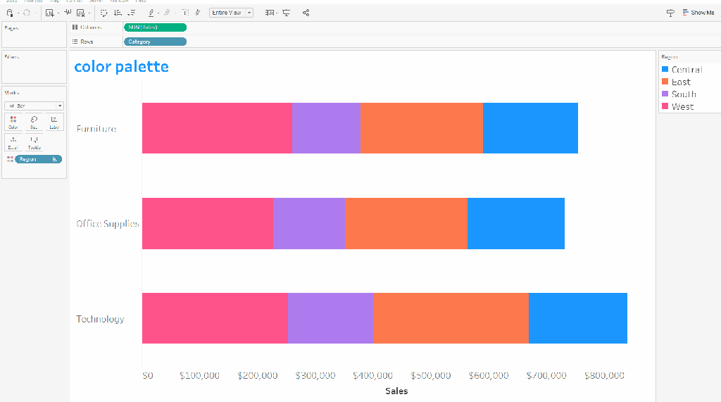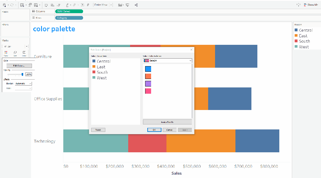- Add colors to custom colors by dragging them to one of the custom color rectangles. Tableau retains these custom colors until you replace them.