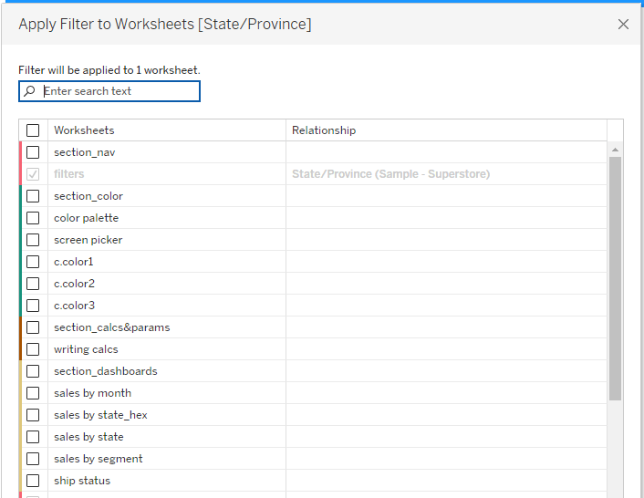 Color coding helps you stay organized, but is also handy when you apply a filter to selected sheets. The interface shows you the color of each tab, making it easy to apply filters to all the same colored tabs.