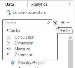 Use the “Search” functionality in the Data pane. Hit Ctrl + F to search for a field. Use the filter icon to filter by field type. This is especially useful to filter by calculated fields.