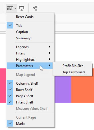 Use the “Show/Hide” card icon to add cards to your view. It’s much faster to go to one spot to grab all the cards you want (legends, filters, parameters, etc.) than jumping all over the workspace to grab each one.