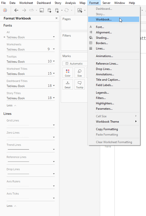 Applying workbook level formatting is a great return on investment. You can set default fonts, sizes, and colors, and apply default settings to all line types in Tableau (e.g., grid lines, zero lines, axis lines, etc.) at the workbook level.