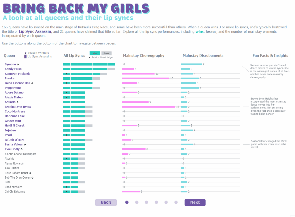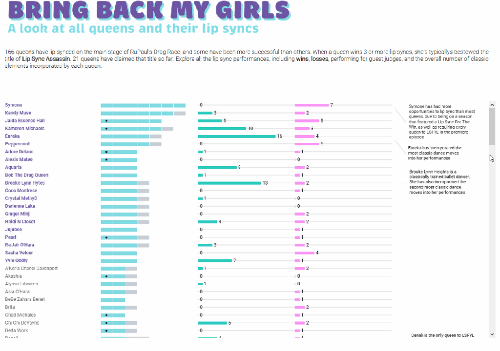 Sometimes you have adequate functionality, but it could be improved upon. For my RuPaul’s Drag Race viz, I initially designed the “Bring Back My Girls” section as one large scrollable chart. It worked, but it felt a little bit clunky: