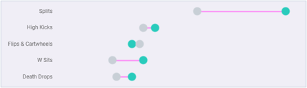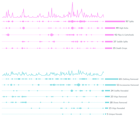 This chart was also wrong because it didn’t take into account the two categories I was showcasing: choreography and disrobing. I ended up changing direction and making the chart below, which is much simpler, but answers my questions and displays the data well. Simple charts done well are often the best choice to showcase your data and tell your story.