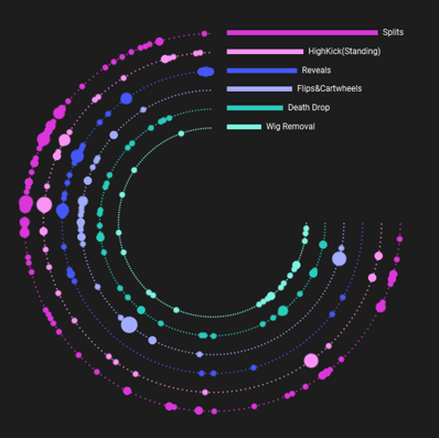 Sometimes you have your heart set on a complex chart, and who can blame you?! They can be eye catching and fun to experiment with, but a lot of times they aren’t the best choice for your data. Charts should support your data and your story rather than detract from them, and complex charts have a way of obfuscating the data. Here’s an example where I was tempted by the dark side of complex charts in my RuPaul viz. I wanted to show elements featured in each lip sync with this layered radial chart (this was made prior to landing on my final design, which is why the colors are so different):