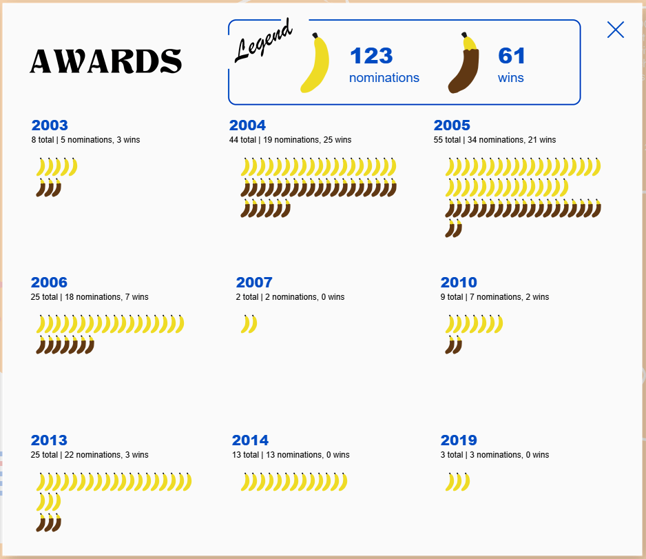 //less than 20 awards for noms and wins, line up 2 rows of bananas – wins right under noms)