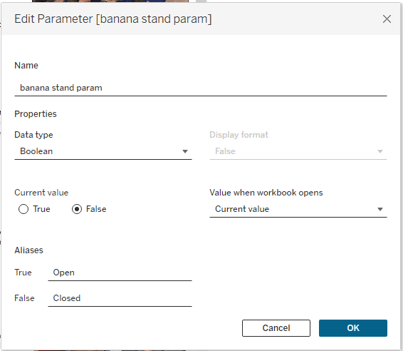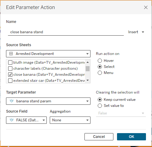 I overlayed “open banana” on top of the image of the Banana Stand, then set up a parameter action. When I set up a parameter action, I like to think about it in layman’s terms. So what the parameter action below is saying is, “When the user clicks (i.e., run action) on the open banana sheet (i.e., source sheet), send TRUE (i.e., source field) to the banana stand param (i.e., target parameter).”