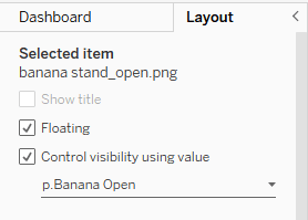 When the banana stand param is set to true, the p.Banana Open calculation will return TRUE, effectively opening the Banana Stand. Anything I want to show when the Banana Stand is open will need to have DZV controlled by p.Banana Open. You apply DZV in the Layout Pane and select “Control visibility using value”.