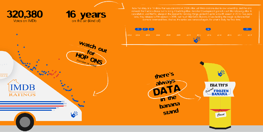 - IMDb episode ratings: Dot chart placed in the Bluth Company logo (I liked the way the logo looked like an X and Y axis, so I played on that).