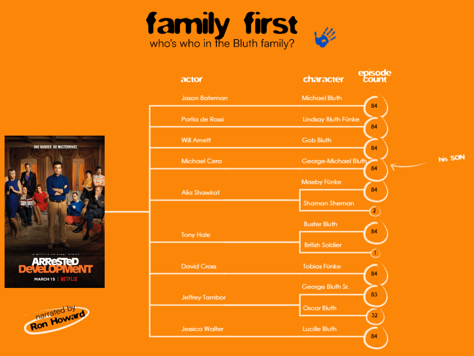 However, the viz felt as incomplete as one of Gob’s illusions, and it was lacking something in both design and storytelling (and magic). That’s when I remembered what Michael Bluth always says: “Family first”, and added the family tree to show which actors portrayed which characters.