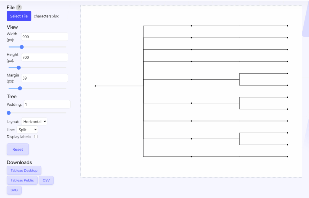 To use the AdvViz tool, upload your file, use the panel on the left to adjust the settings and layout, then download to Tableau.