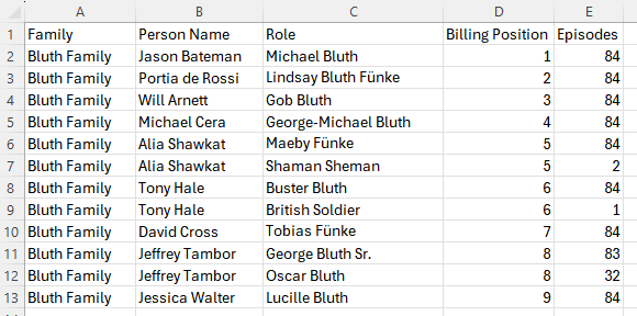 The Data+TV dataset includes the top 10 billed actors for each episode of a show, which conveniently aligned with the Bluth family dynamic; the top 9 billing spots are held by the 9 members of the Bluth family. Unfortunately, this meant I couldn’t showcase all the supporting characters and big-name guest stars. For example, Mae Whitman (her?), Charlize Theron (Mr.F), Ben Stiller (did someone say “Wonder”?), and Justin Grant Wade (Steve Holt!) weren’t included in the data for all the episodes in which they appeared, so I scrapped that data and focused just on the family.