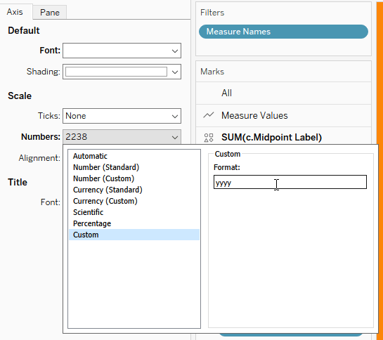 I needed to format the axis to look like a year rather than a whole number. To do that, I added some custom number formatting to the axis.