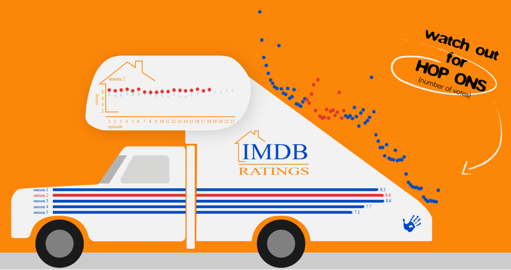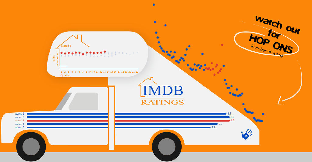 - IMDb episode votes: This is another dot chart placed on the stairs of the car. When I created this chart it mimicked the slope of the stair car (well, that was a freebie!), so it was only natural to make them the “hop ons”.