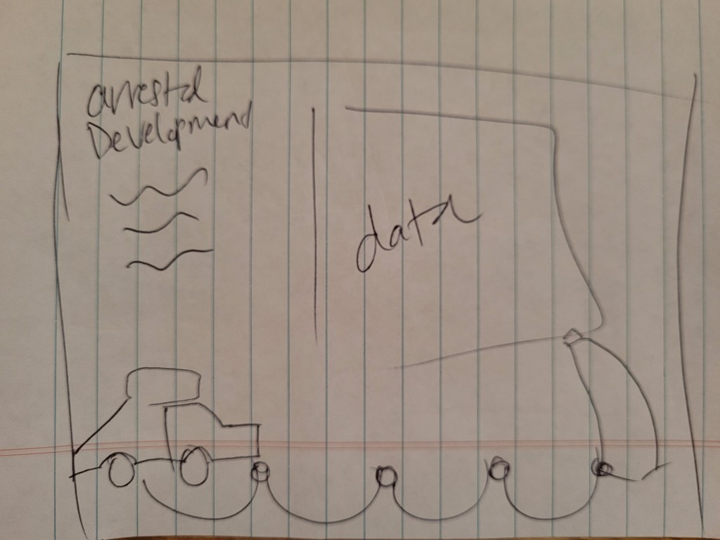 Two of the most iconic elements in the show are the Bluth Banana Stand and the Stair Car, so I knew I would incorporate them in the design in some capacity. I originally thought about using Lisa Rapp’s amazing show business viz as inspiration, and having the Stair Car “drive” through the viz. I also thought about putting all the data in the Banana Stand and having a menu the user could click through to display different charts. However, that didn’t leave a lot of space to showcase the data, nor did it leave anywhere to put the Stair Car. Here are the early sketches I did of these two ideas: