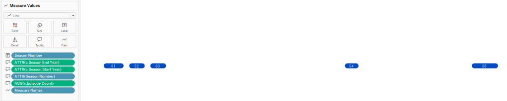 I took the season start and end years and converted them from dates to whole numbers. I did this by duplicating the Season Start/End Date variables and changing the data type to a whole number. I used those 2 duplicated variables as measure values, and put measure names on path to connect them with a line.