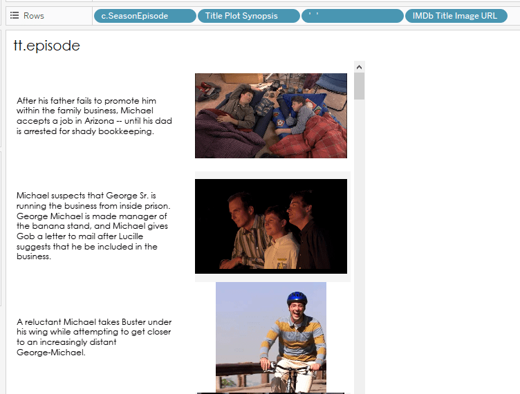 The IMDb data includes a variable called “IMDb Series Image URL”, which houses the URL for the image that IMDb uses for the show. I set that variable to use image role by right clicking it and selecting Image Role -> URL. This allows the variable to render as an image within Tableau. I put that variable on its own sheet and used it to represent the Bluth Family node of the tree.