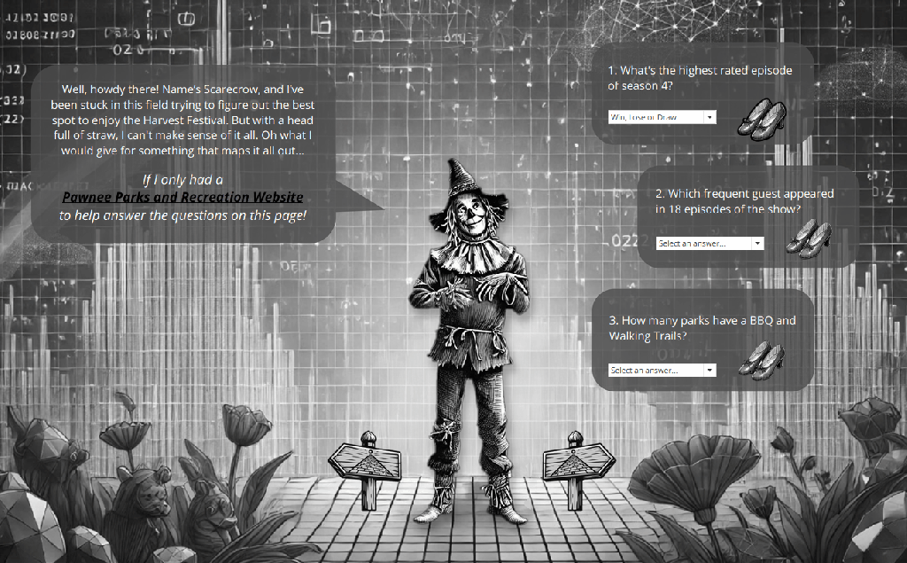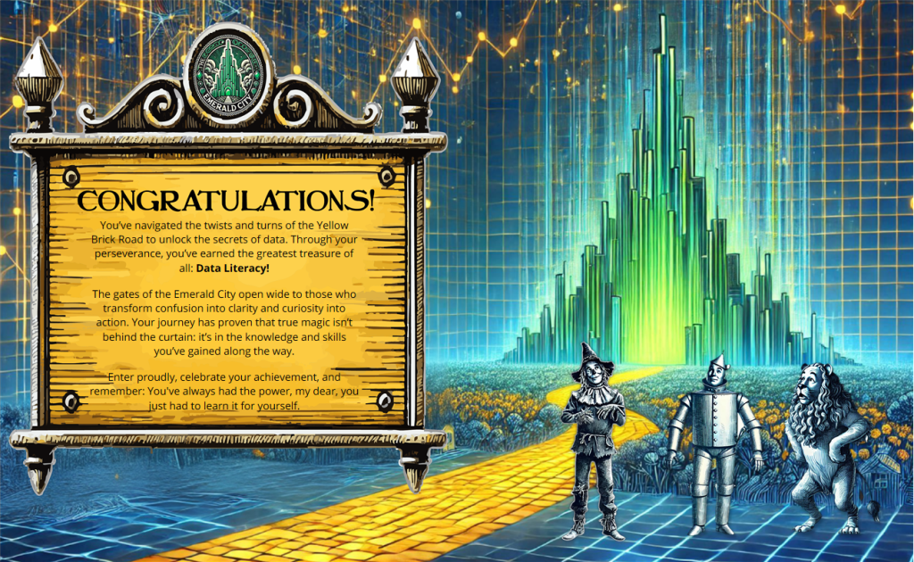My latest creation, Emerald City Insights, invites users to follow the Yellow Brick Road, meet the Scarecrow, Tin Man, and Cowardly Lion, and help each character answer questions about key dashboards at our organization. If all goes well, their world shifts from black & white to full Technicolor, and the gates of the Emerald City swing open and welcome them to a world full of data literacy.