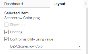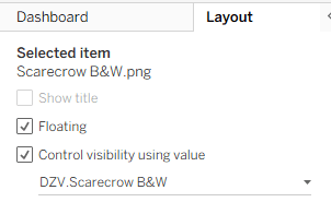 Turning the viz from black & white to Technicolor is handled using Dynamic Zone Visibility (DZV). DZV.Scarecrow B&W and DZV.Scarecrow Color evaluate whether the challenges have been answered correctly. If they have, DZV.Scarecrow Color returns TRUE; if not, DZV.Scarecrow B&W returns TRUE.