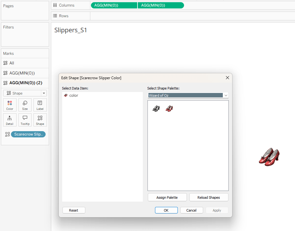 As mentioned earlier, the ruby slippers are controlled by the Scarecrow Slipper Color calculation. This field is placed on Shape for all Scarecrow slipper sheets, assigning a black & white slipper when the value is FALSE and a ruby slipper when it is TRUE.
