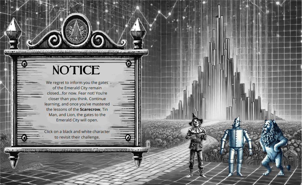 Once all challenges have been answered correctly, all characters are in color, the gates to the Emerald City open, and congratulations text appears.