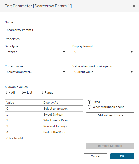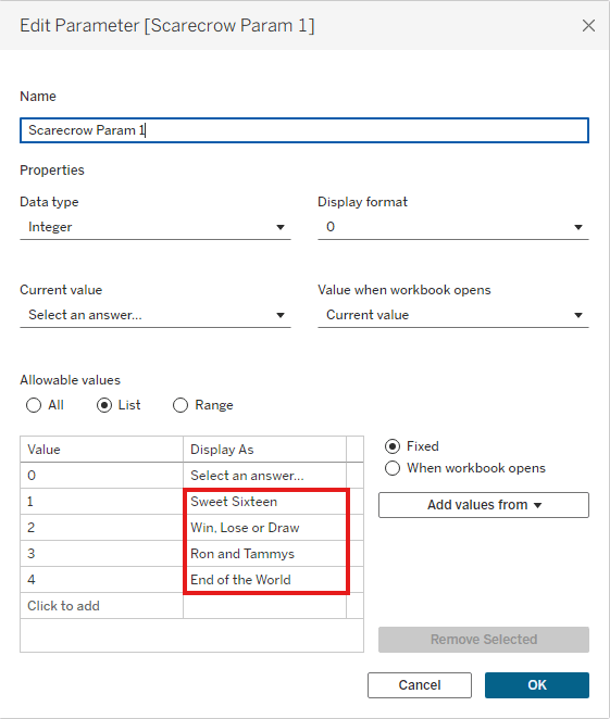 • Adjust the “Display As” values for Values 1 through 4 on each of the parameters to show answer options for your questions.