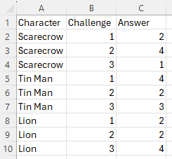 The data is an excel file that lists each character, their challenge number, and the numeric value for the correct challenge answer.
