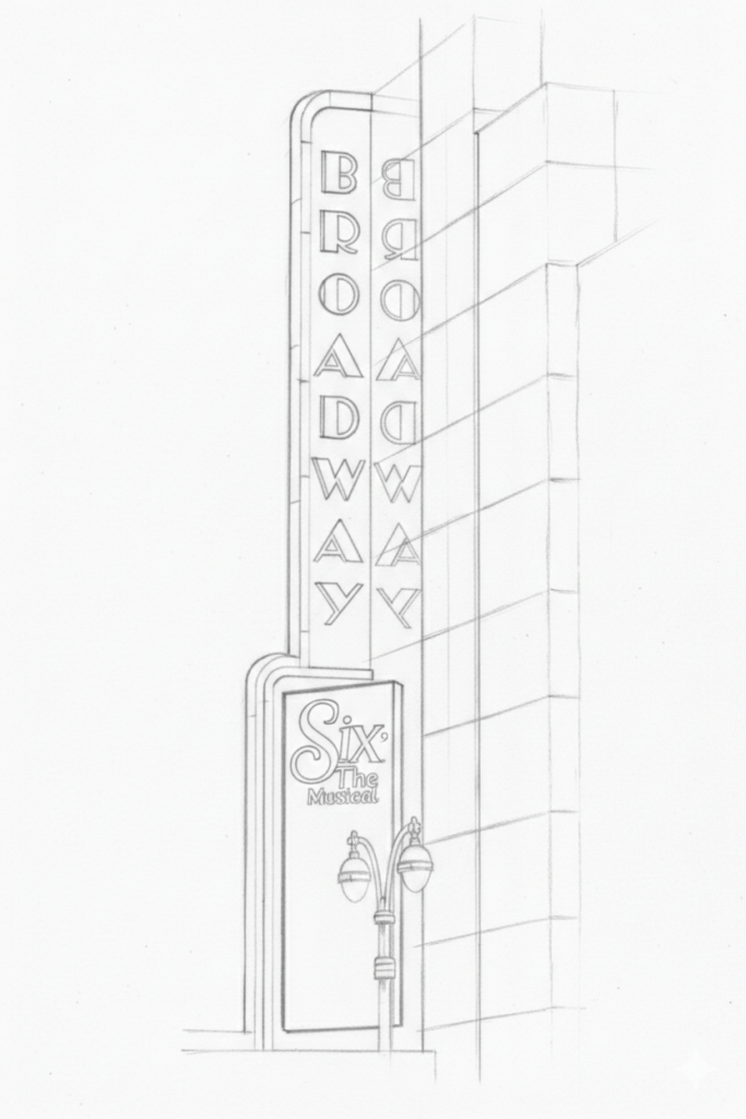 Once that idea clicked, the design took shape. I started by creating the visuals, and instead of building everything from scratch in Illustrator (which would have taken hours), I used Google Gemini to generate pencil-style sketches of a Broadway conductor as a queen, a Broadway sign, and a castle. I also used an image from SIX to help inspire the sketch of the queens.