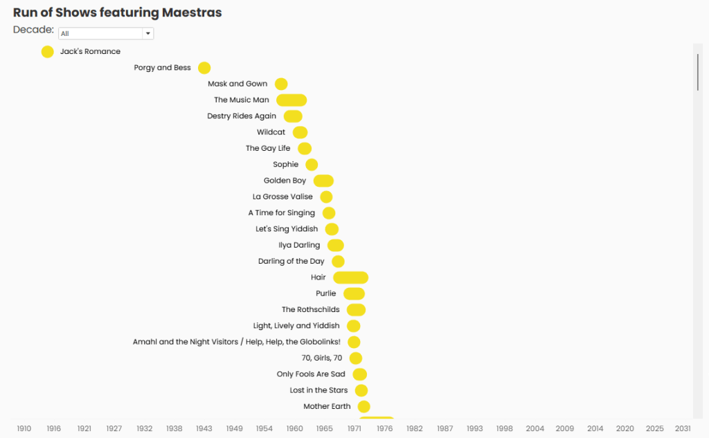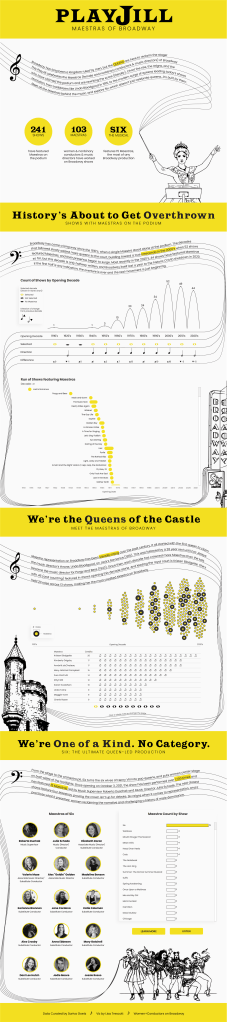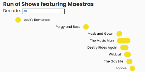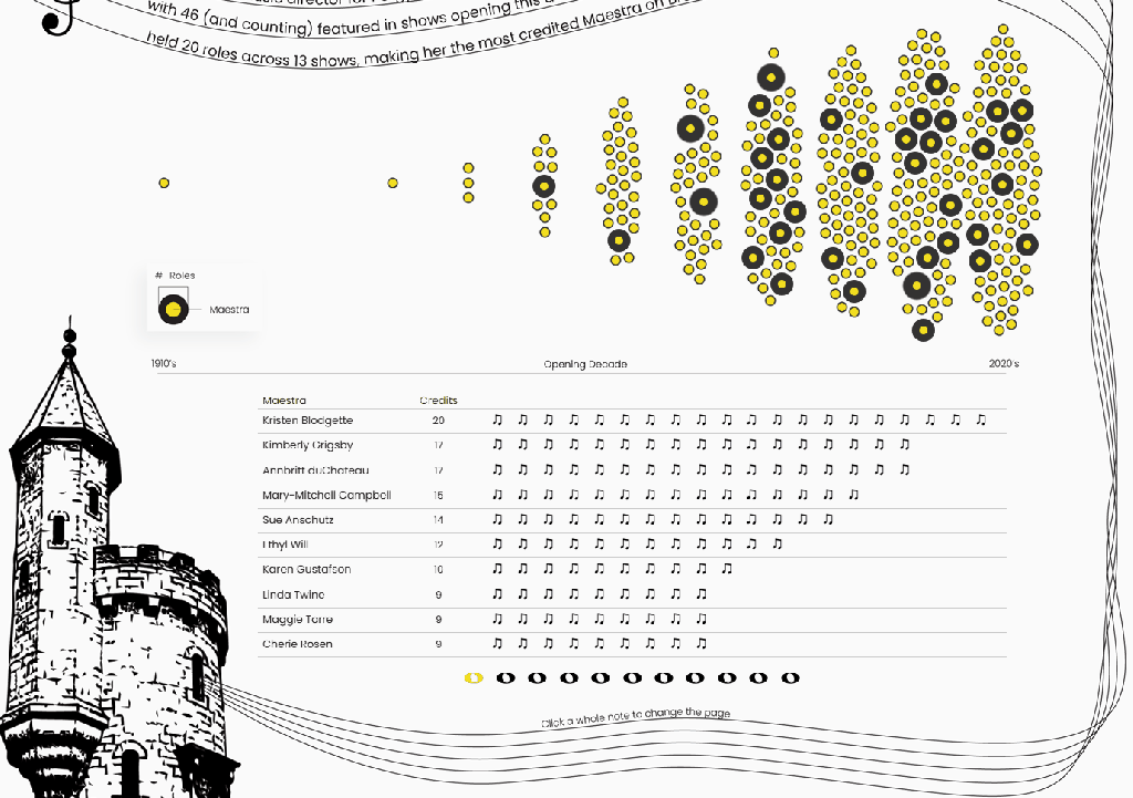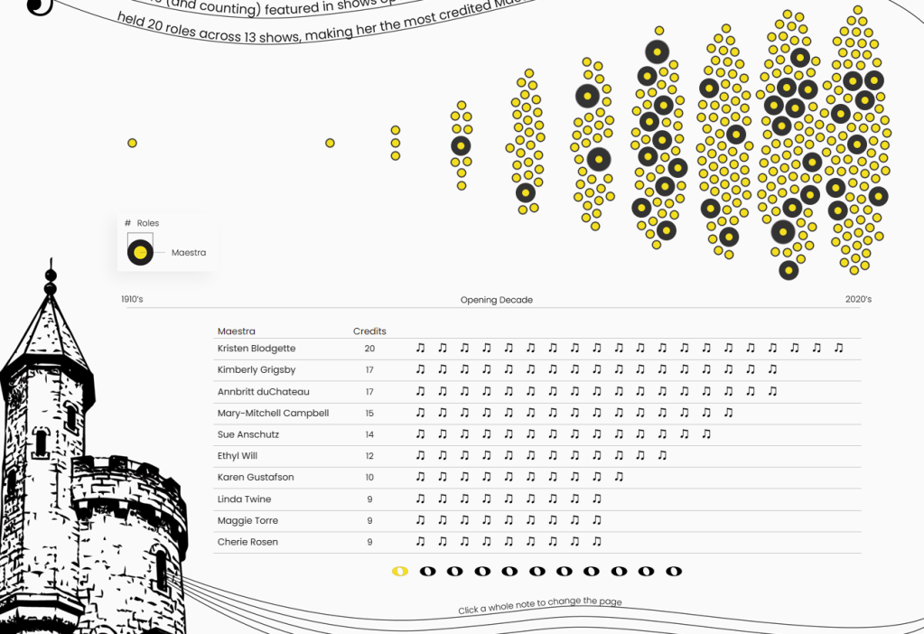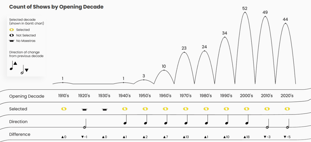 When I started thinking about how to show the Broadway shows and the rise in Maestras over the last century, I wanted something that felt musical. Ultimately, I landed on a jump plot because it reminded me of slurs and ties on sheet music (i.e., the curved lines on sheet music that connect notes and give music its flow). I placed it above a sheet music-inspired table to help drive that imagery home.