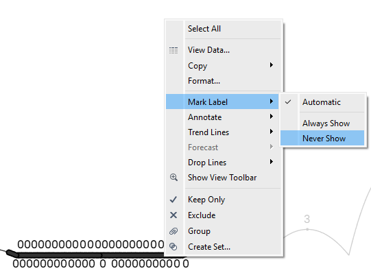 My solution was to hide the mark labels for those decades. I highlighted all the points for the 1930’s and 1940s, right clicked, chose “Mark Label”, and “Never Show.” Problem solved!