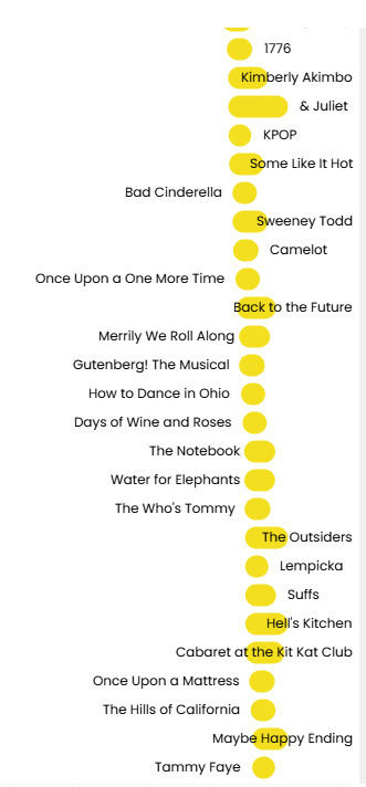 This show caught my attention for another reason too. I’ll admit, I’m not exactly a Broadway buff, but Six is actually one of the few shows in this dataset that I’ve seen. I went with some of my girlfriends when the show came to San Diego, and it was such a fun and empowering experience. I loved the music and I loved the story. Six is all about women reclaiming their narrative and challenging a history shaped by male voices, which made it the perfect anchor for the viz, and it ended up shaping both the storytelling and the design of PLAYJILL.