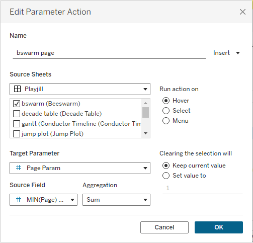 On the dashboard, I then created a parameter action on the beeswarm that runs on hover. When a user hovers over a maestra in the beeswarm, the action updates the Page Param to that maestra’s corresponding page, which automatically updates the unit chart to display and highlight her roles.