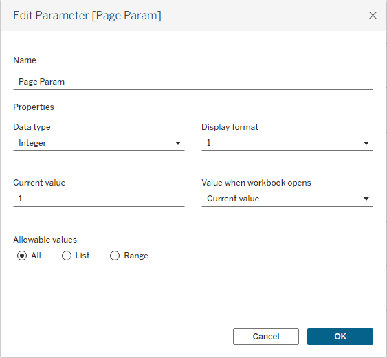To achieve this functionality, I created an integer parameter for the pages, with allowable values of “All”.