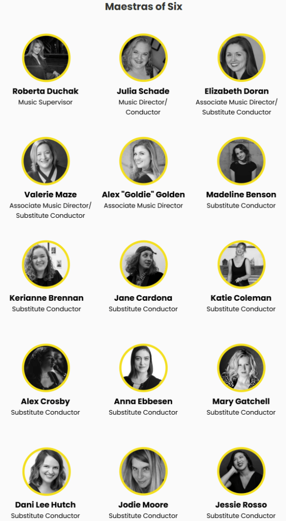 Because Six features such a large number of maestras compared to other shows in the dataset, it felt important to make the individuals themselves more visible. By incorporating their photos, it helps connect the roles to the real maestras who have conducted the show, and celebrates the individuals who have helped make Six such a standout when it comes to representation.
