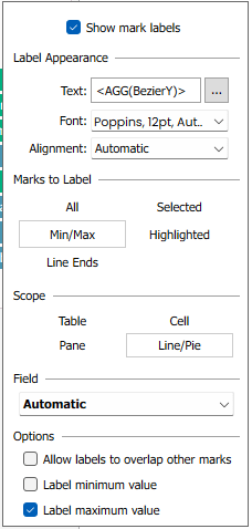 I had never built a jump plot before, so I used this wonderful tutorial by Erica Hughes. One thing I had to figure out beyond the tutoral was the labels. I wanted them at the max points of each curve, so on the Label card, I selected “Min/Max” and checked “Label maximum value”.